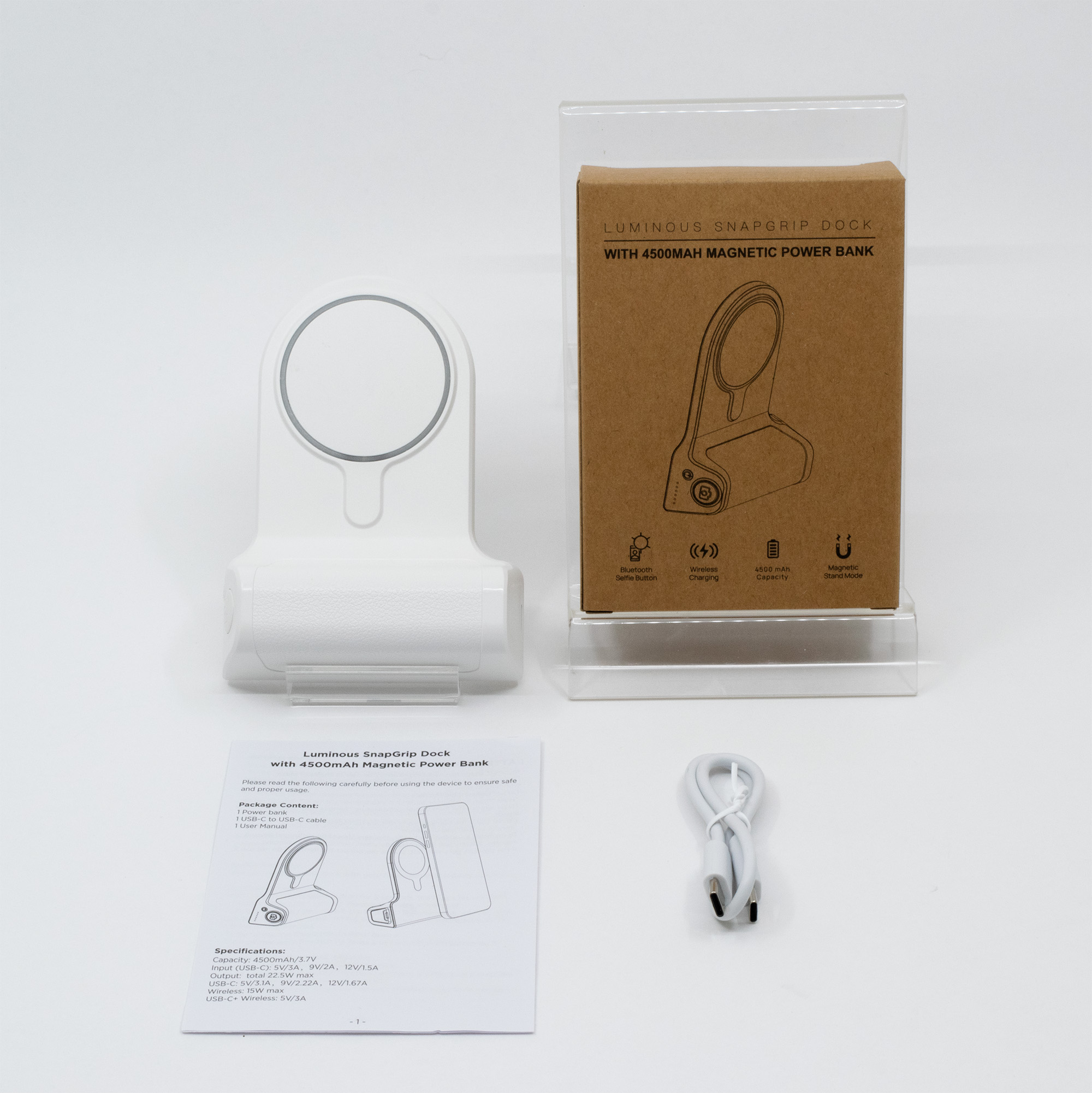 Transform your smartphone into a pro-style camera with the Luminous SnapGrip Dock. Featuring an ergonomic, pocket-friendly design, Bluetooth shutter button, and a 4,500mAh MagSafe-compatible power bank, it keeps you shooting longer without battery worries. Switch between portrait and landscape with ease, enjoy hands-free use for calls or streaming, and snap instantly with the magnetic mount. Stylish, portable, and versatile—perfect for creators and everyday users alike.