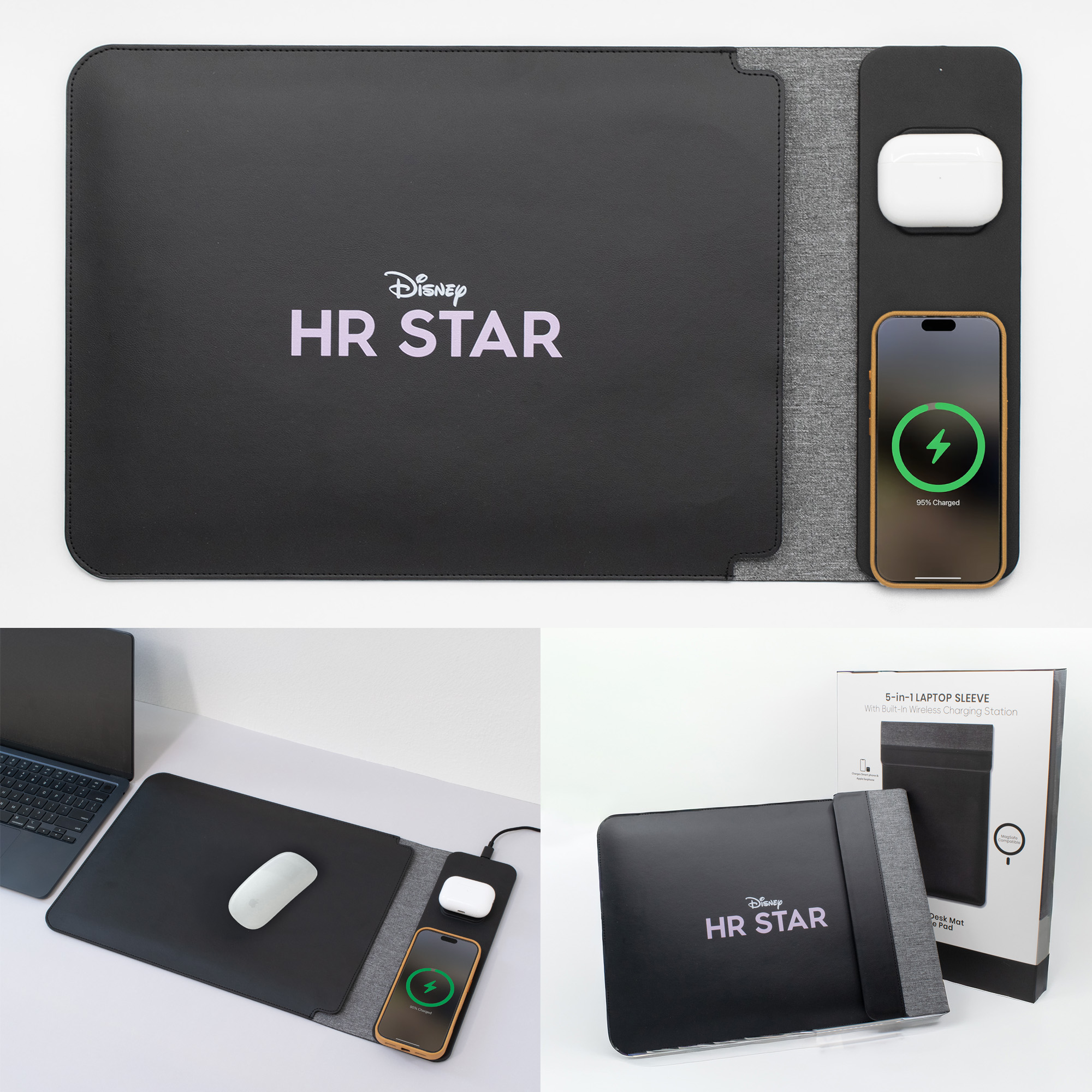 The Nomad Laptop Sleeve is an all-in-one laptop sleeve, portable mousepad/desk mat, and dual wireless charger for your smartphone and earbuds.